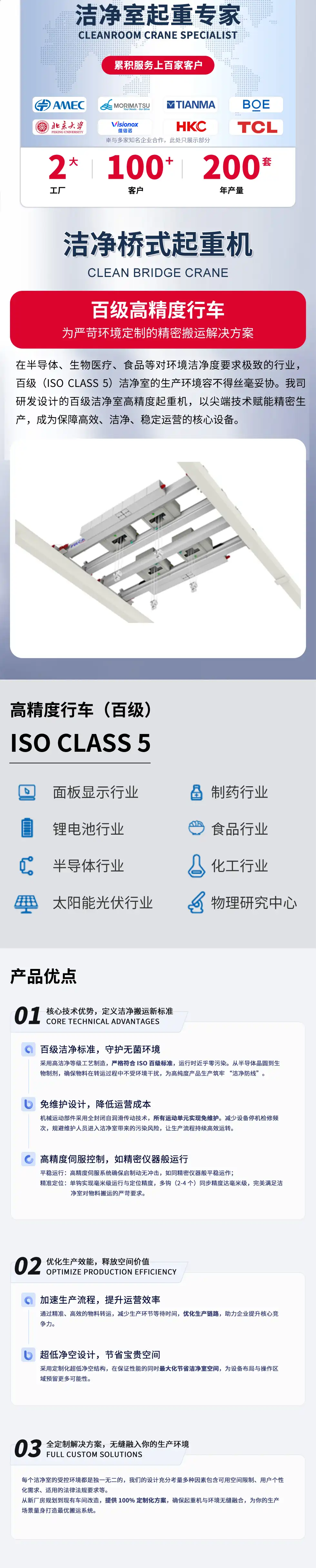 百级高精度行车—为严苛环境定制的精密搬运解决方案在半导体、生物医疗、食品等对环境洁净度要求极致的行业,百级(ISO Clas...